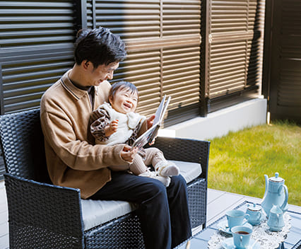 妻はお菓子作りが趣味で、アフタヌーンティーのセットがあるので、外で優雅なティータイムを楽しんでいます。姉家族が来た際にプール遊びをしたのですが、空間が広々しているので、甥っ子はすごく楽しそうでした。うちの子も大きくなったら、庭でもっと遊べますね。テラス部分が広いため、洗濯物が干しやすいところもいいですね。布団も心置きなく干せます。